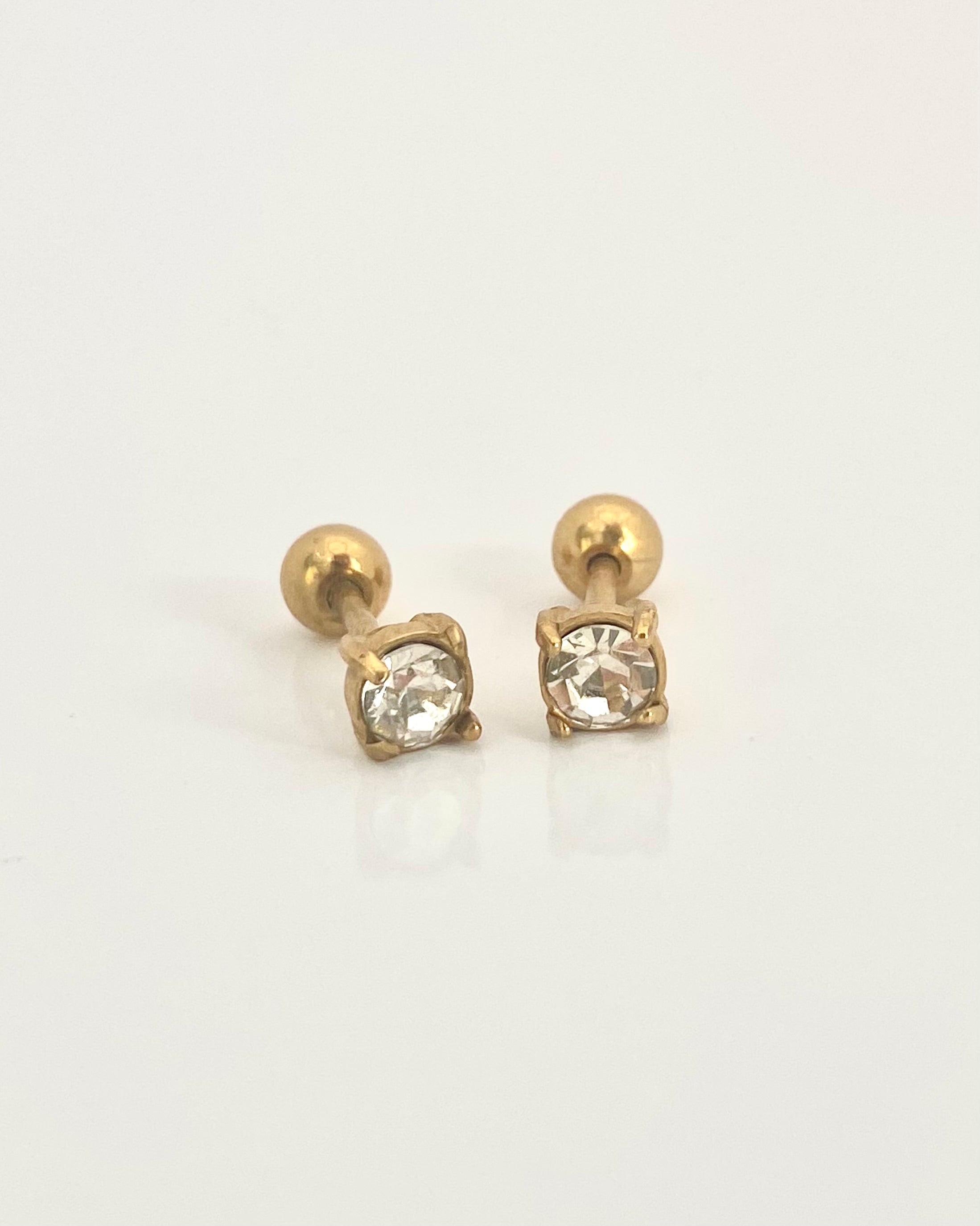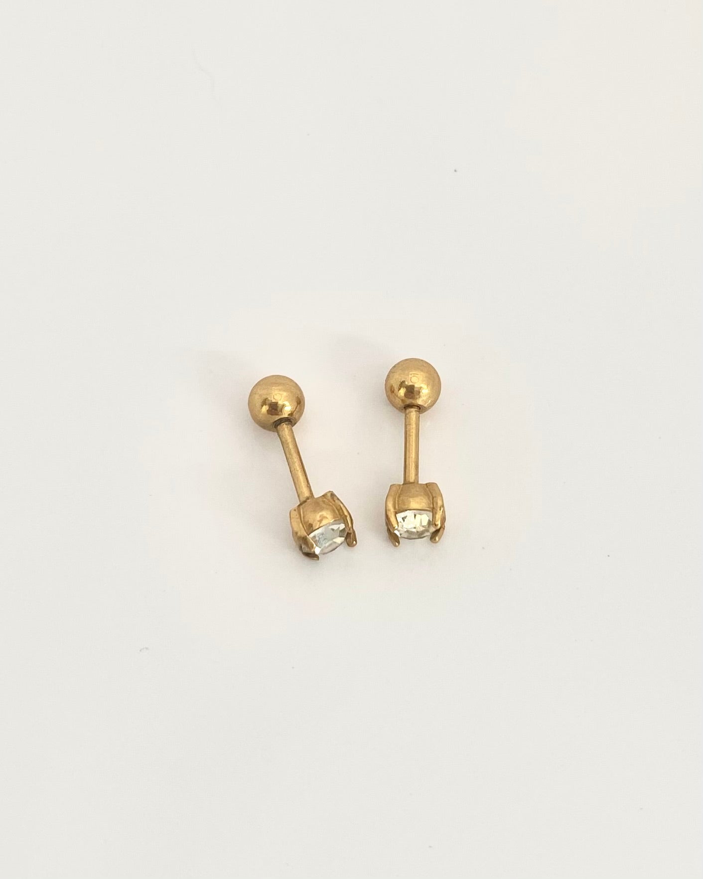 Diamantové napichovacie náušnice ukončené guličkami na šróbovanie pre pohodlnejšie nosenie. Vyrobené z nehrdzavejúcej ocele pozlátenej 18k zlatom. Kamienky sú vyrobené zo zirkónu.